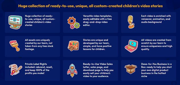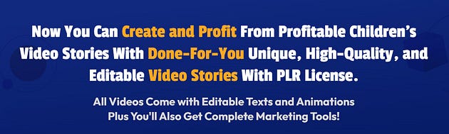 KidToons Canva is a done-for-you package of children’s video stories, each enriched with engaging animations, voiceovers, and audio backgrounds. This product stands out due to its Private Label Rights (PLR), allowing users to rebrand, resell, and profit from the videos as their own. It includes a full marketing toolkit to help you launch your digital product business in the highly profitable children’s entertainment niche.