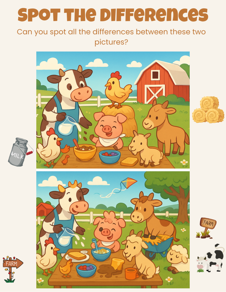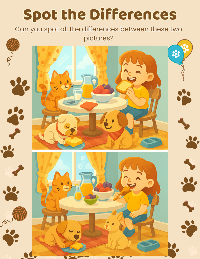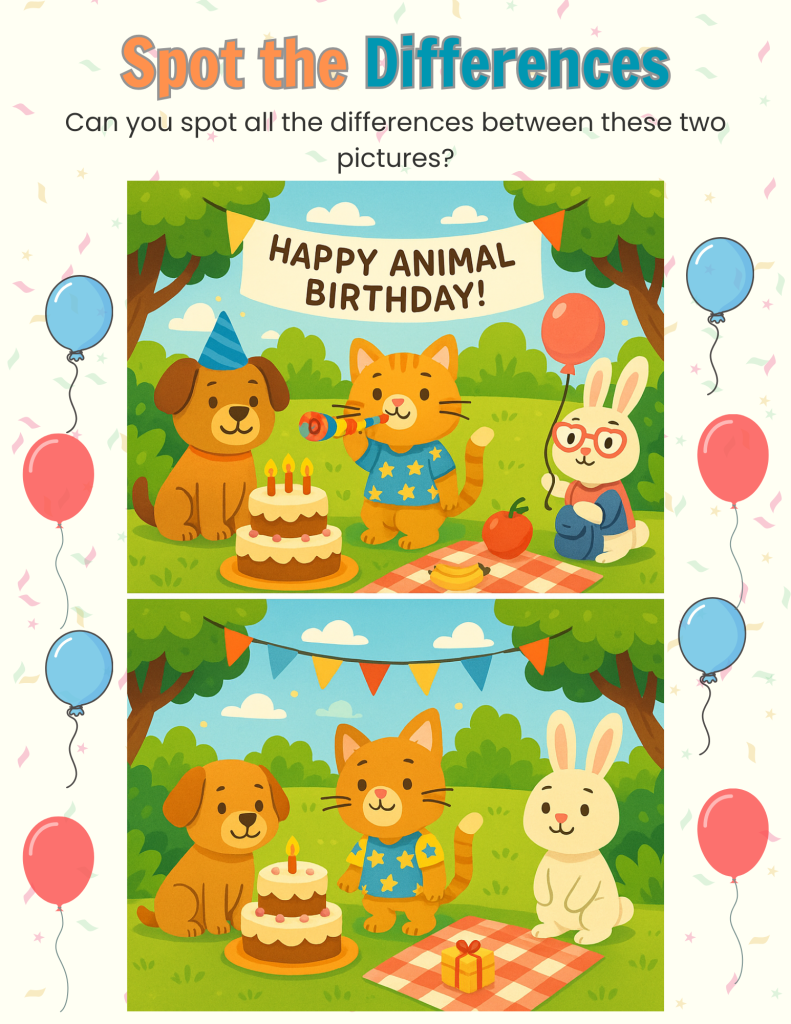 ✅ Instantly generate fun, side-by-side animal scenes with playful differences to spot (usually around 5 per puzzle, sometimes more) — perfect for activity books, printables, classrooms, and more.