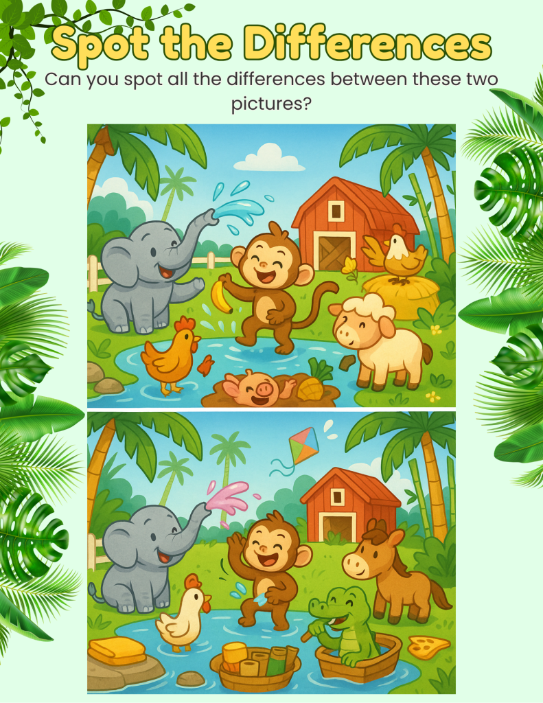 With Spot the Animal, you can instantly create vibrant “Spot the Difference” puzzle scenes — perfectly aligned pairs of images with just the right number of playful changes to keep kids engaged.